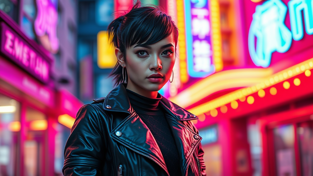 A hyper-realistic sci-fi scene featuring a woman with sharp, striking features, standing confidently in front of a vibrant neon sign that casts a kaleidoscope of colors on her face. She wears a futuristic leather jacket, blending steelpunk elements with an elegant Mote Kei influence, reminiscent of a modern superhero from the DC Comics universe. Captured in a candid moment, her powerful presence resembles that of a famous cultural icon. The image, shot with the precision and clarity of a Sony Alpha A1 camera, highlights the intricate details of her attire and the luminous urban landscape surrounding her.