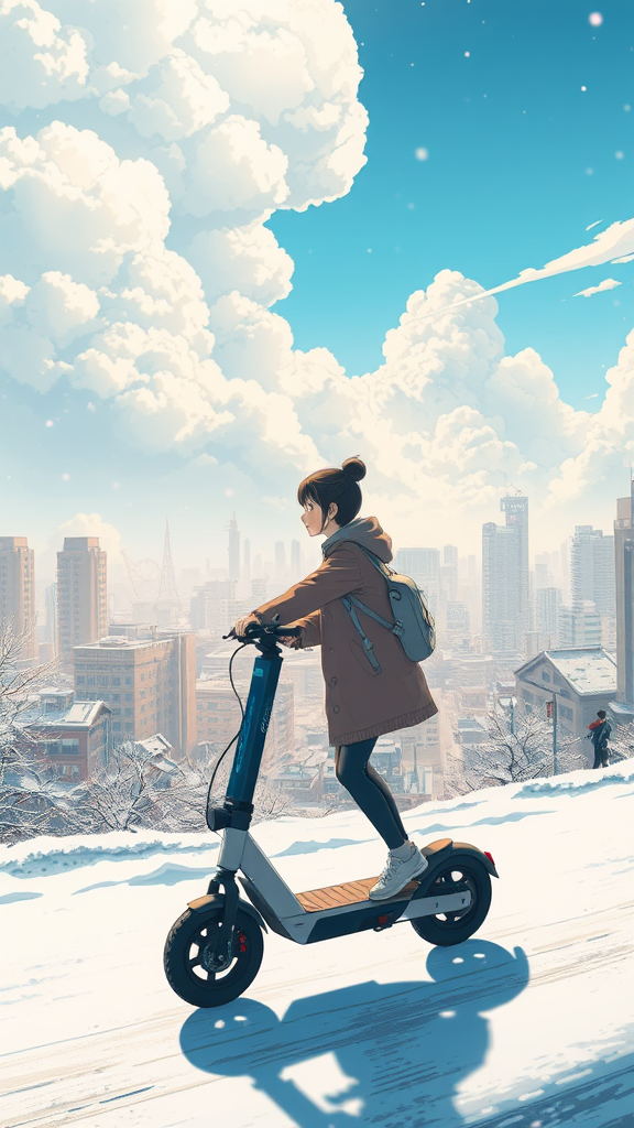 A young girl glides gracefully on her electric scooter through an enchanting anime scene inspired by Hayao Miyazaki: a snow-dusted Tokyo cityscape unfolds before her, with colossal, dreamlike clouds drifting across an azure sky. The city, blanketed in pristine snow, sparkles under the bright, golden sunlight, creating a surreal yet familiar world. The landscape, rich with Miyazaki's whimsical imagery, blends seamlessly with touches of traditional Japanese art, capturing the magic of a wintry urban wonderland.