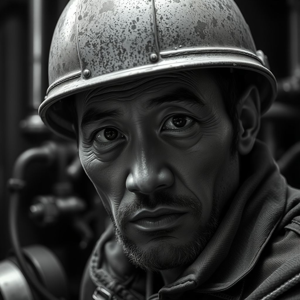 Capture the essence of the most exquisite artwork in the world for a man, set in a breathtaking and realistic industrial mechanic setting. The image should depict a rugged worker in a challenging work environment, captured in an action shot that reveals every detail, from skin pores to intricate iris details, all under dark lighting with heavy shadows. The portrayal should be rich in detail with an emphasis on a well-defined face, inspired by the styles of Artgerm and WLOP Ilya Kuvshinov. Set the scene in black and white, emphasizing Asian features, and focus on creating a high-resolution unity render with sharp focus, smooth illustration, and an octane render feel, reminiscent of concept art found on ArtStation. Avoid any elements that suggest blurriness, boredom, or poor quality, ensuring the artwork remains pristine, uncropped, and free of any distracting artifacts or signatures.
