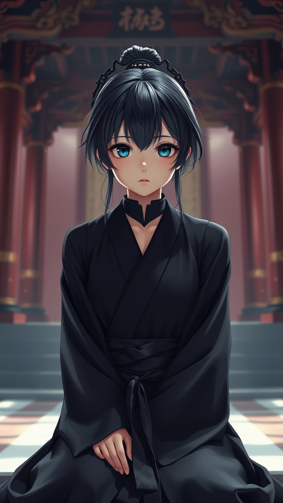 1girl, wearing elegant dark robes, seated in a majestic temple setting, her eyes perfectly symmetrical and striking, captured in dramatic lighting that accentuates every detail. The scene is rendered with hyperrealism and features sharp focus and high-definition clarity, showcasing an intricately designed environment. Utilizing advanced raytracing techniques and physics-based rendering, this composition results in a high-detail RAW color photograph with ultra-high resolution. The image embodies the best of CG artistry, seamlessly blending elements of 3D design with a touch of anime-inspired aesthetic. The character is portrayed in a flawlessly proportioned and artistically refined manner, ensuring a highly detailed and visually captivating portrait without errors or distortions.