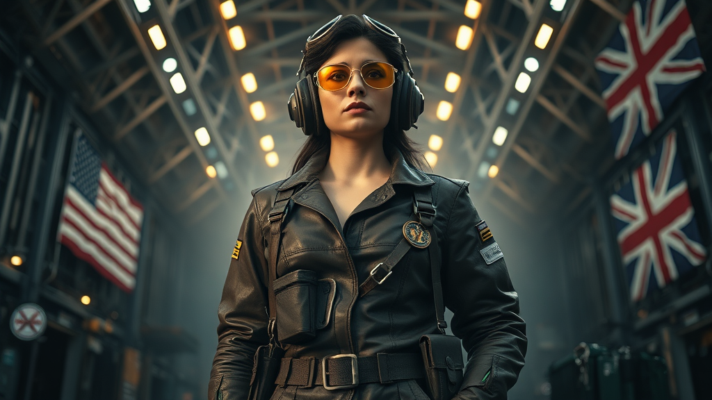 In a vast spacecraft hangar, a heroic female mechanic stands poised with confidence, her intricate, highly detailed formal Oak Cool Pewter leather uniform gleaming under the sci-fi, futuristic lights. With a cyberpunk flair, her uniform is adorned with medals and a utility belt, reflecting her expertise. The dramatic cinematic lighting casts her in a low angle shot, capturing her dynamic action posture. She wears golden pilot sunglasses, complementing her highest facial details, rendering her expression a masterpiece. The setting is 8k high definition, with the scene enveloped in a shadowy atmosphere. Around her, realistic fabric details and folds highlight her attire, along with an array of tools by her side. She wears a helmet with hard surfaces, symbolizing her readiness for any task. Behind her, a subtle backdrop features a flag with stars and stripes alongside the Union Jack, adding to the ambiance. The focus remains on her strong presence, with uninspired elements replaced by her unwavering resolve and skill.