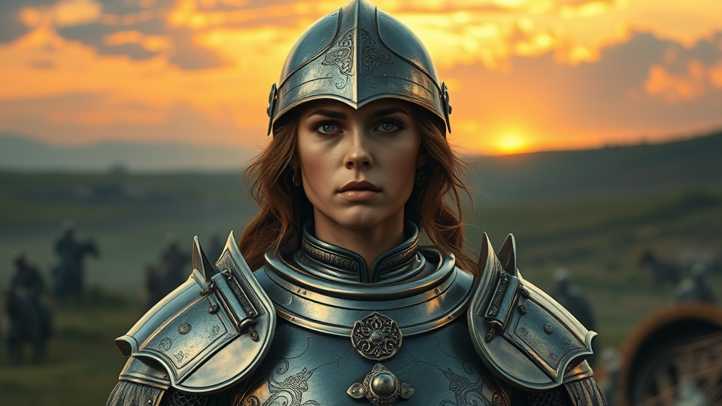 A resolute woman clad in intricately detailed armor with her visor lifted, revealing a determined expression reminiscent of Joan of Arc, set against a backdrop of a medieval landscape; her armor gleams under a soft, dappled light, reflecting hues of silver and gold, while hints of deep emerald green adorn the edges. The sky above is painted with the warm hues of a setting sun, casting a serene yet empowering aura over the scene, capturing the essence of courage and conviction in a timeless, painterly style.