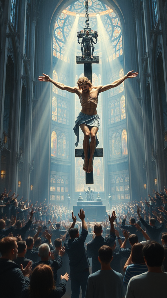 A striking impressionist oil painting depicts a magnificent cybernetic Christ suspended from a techno cross, adorned with intricate futuristic implants. A congregation of devoted believers surrounds Him, their hands raised in reverent worship within a colossal techno cathedral. The atmosphere is grandiose and futuristic, characterized by a blend of cyberpunk, sci-fi, and neo-futuristic elements. The scene is shrouded in a dark ambience, with dramatic rays of light piercing through towering stained glass windows, creating a cinematic and volumetric lighting effect. The painting captures the essence of a new faith in technology, as people gather at the altar of innovation to worship a cyber Christ, all portrayed in an impressionist style reminiscent of Claude Monet. The ultra-wide shot provides a sense of depth and scale, with a focus on the emotive connection between humanity and technology.