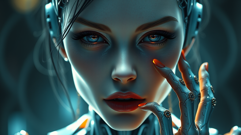 Artificial intelligence female face android, ultra-detailed graphics, cinematic lighting, 4k resolution, featured on artstation, hyperrealistic, with intricate detailing, powerful presence, showcasing rim lighting and diffraction effects, rendered with RTX capabilities, inspired by Ivan Shishkin. Low resolution, with text overlay, cropped, exhibiting low quality with jpeg artifacts, unappealing, duplicate imagery, morbid and mutilated aspects, portions out of frame, featuring extra fingers, mutated and poorly drawn hands, flawed face depiction, mutations, blurry and dehydrated appearance, anatomical inaccuracies, disproportionate features, presence of extra and malformed limbs, fused and excessive fingers, unnaturally long neck.