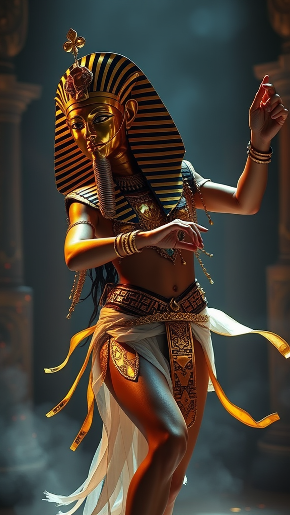 Glam metal Ishtar adorned in King Tut's golden shamrock mask, art by Antonio J. Manzanedo, striking a dynamic pose, performing an enchanting dance, enveloped in atmospheric lighting, infused with a touch of magic, captivating and vibrant ambiance.