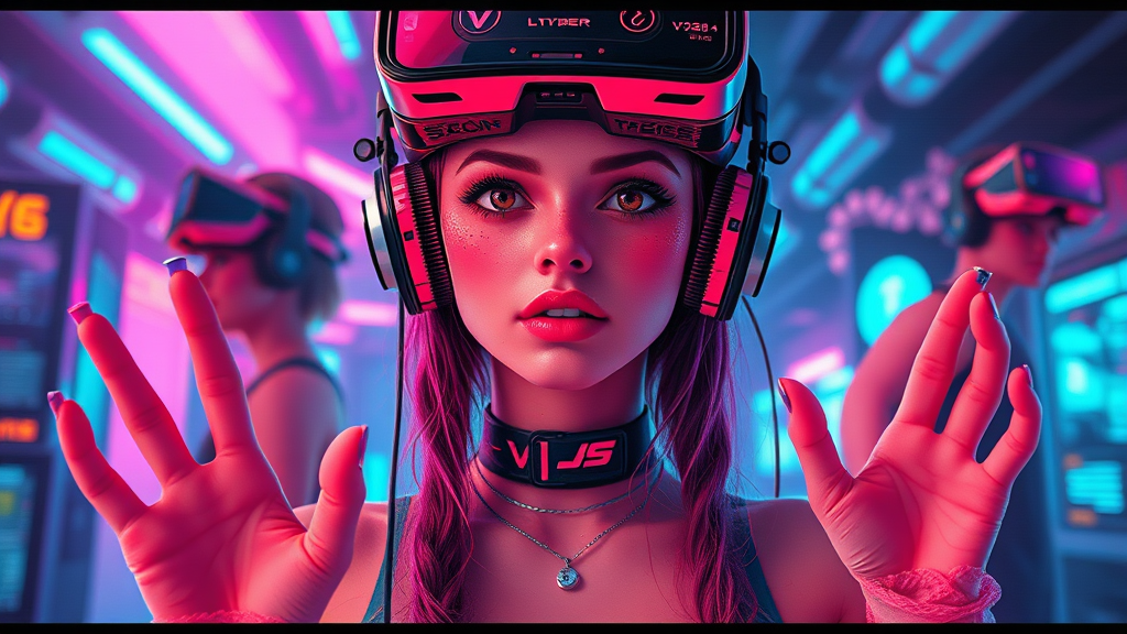 Vibrant female VTuber in a cyberpunk setting with sleek VR headsets, rendered in 4K with high detail and synthwave elements. The image embraces chaotic aesthetics with glitches, low resolution effects, and vintage text errors. Distorted anatomy with unusual finger count, misplaced limbs, and anomalies like extra legs and arms. Composition combines cropped sections, disfigured features, and experimental framing. Visual noise includes tiling, deformed figures, and textured flaws such as blurry patches, jpeg artifacts, and irregular shapes. Bold artistic choices yield a mutant, abstract appearance with overlapping watermarks and creator's signature.