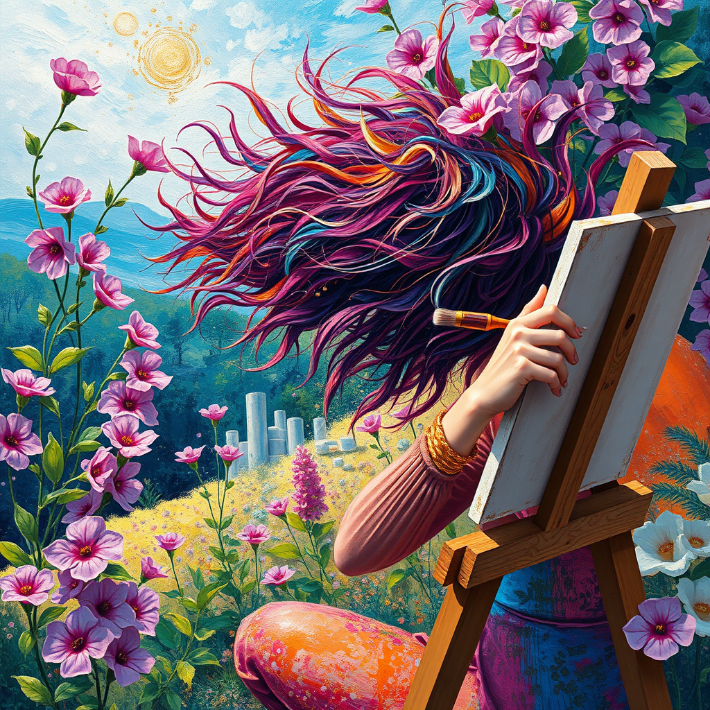 A vivid and imaginative painter passionately creating an abstract masterpiece, their hair a cascade of brilliant colors. The scene is reminiscent of Kazuo Oga's lush landscapes, adorned with blooming flowers in shades of purple and pink. The painter's surroundings are dotted with polka dots, adding a playful element to the artistic environment. This creative vision is captured in ultra-high-definition, showcasing every intricate detail with sharp focus, in a harmonious blend of artistic influences.