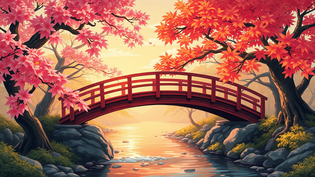A traditional Japanese art style illustration depicting a weathered red wooden bridge gracefully arching over a gently flowing stream, with the scene bathed in the warm, ethereal glow of golden hour sunlight. This light filters through an abstract and harmonious arrangement of stylized cherry blossom and maple trees, their leaves creating a tapestry of vivid colors that blend nostalgia with a contemporary vibrancy. The serene water reflects the soft hues of the sky, embodying a tranquil yet dynamic balance of past and present in this timeless landscape.