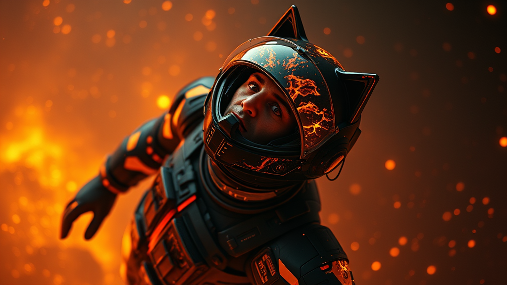 Cinematic film still of a professional 3D model inspired by anime artwork and concept art, resembling a masterpiece oil painting. A futuristic pilot, clad in an intricately detailed space suit reminiscent of science fiction anime, falls backwards into an ethereal cosmos. The suit, surreal and dreamlike, features a psychedelic, vibrantly colored design with glossy, volumetric layers. The pilot's expression is one of panic and fear, evoking a key visual moment. Dramatic lighting highlights a black and fire-orange color scheme with a uniquely aggressive wolf-designed helmet engulfed in cosmic flames. The composition, crafted using octane render, showcases a shallow depth of field with a moody vignette, bokeh effects, and epic cinemascope. The presence of a reactor core adds a futuristic element, while high-budget film grain infuses a grainy, painterly texture, creating an illustrative matte painting effect shrouded in mystery and fantasy.