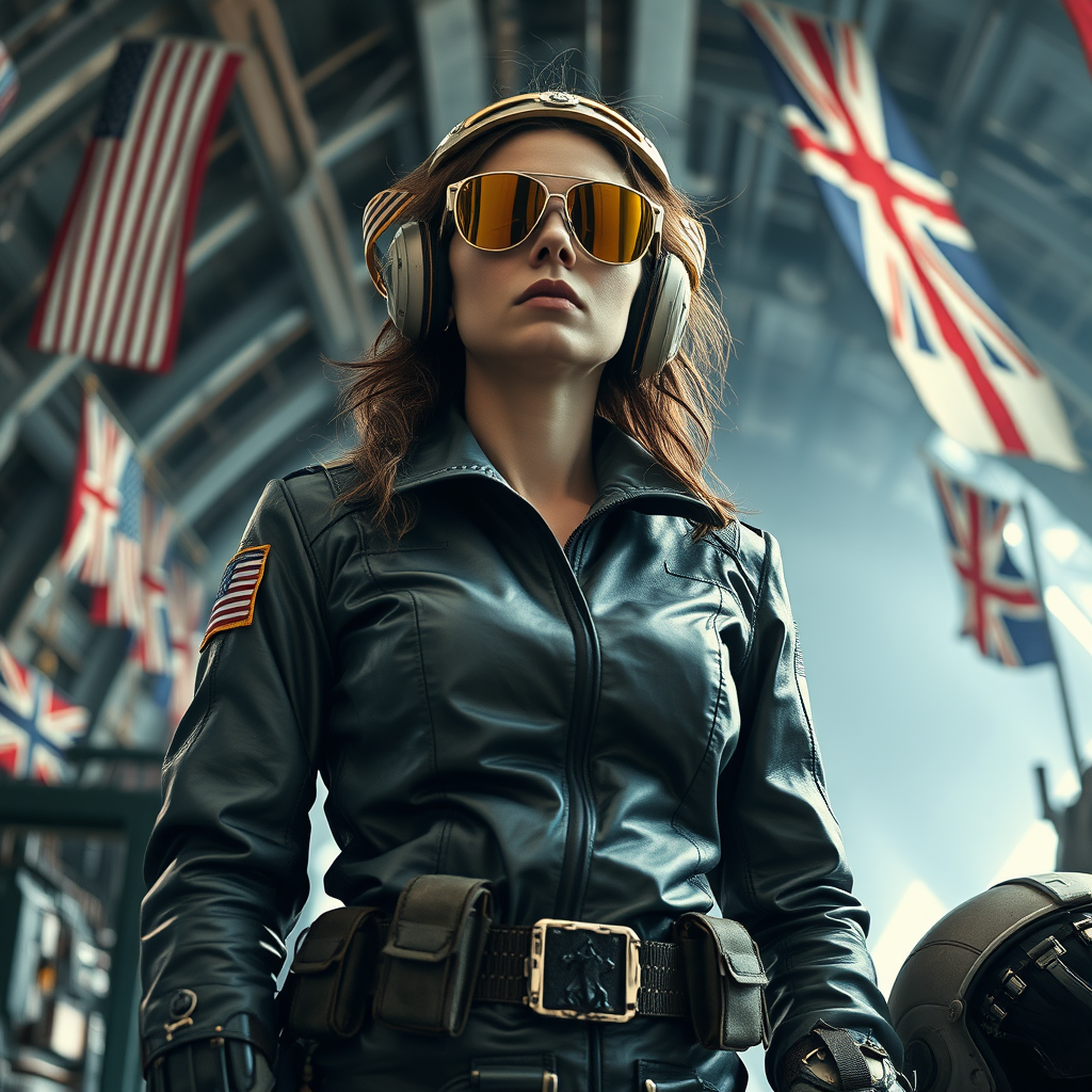 spacecraft hangar heroic female mechanic intricate detailed formal Oak Cool Pewter leather uniform sci-fi futuristic cyberpunk adorned with medals utility belt cinematic lighting from a low angle dynamic action posture to scale wearing golden pilot sunglasses featuring highest facial details portrayed in 8k dark ambiance surrounded by various tools with realistic fabric details and folds vibrant and detailed art a simple background yet highly contrasted sleek and futuristic atmosphere helmet with hard surfaces nearby presence of flags including stars and stripes and union jack representing diverse alliances the environment reflects innovation and progress effectively capturing a sense of strength and empowerment