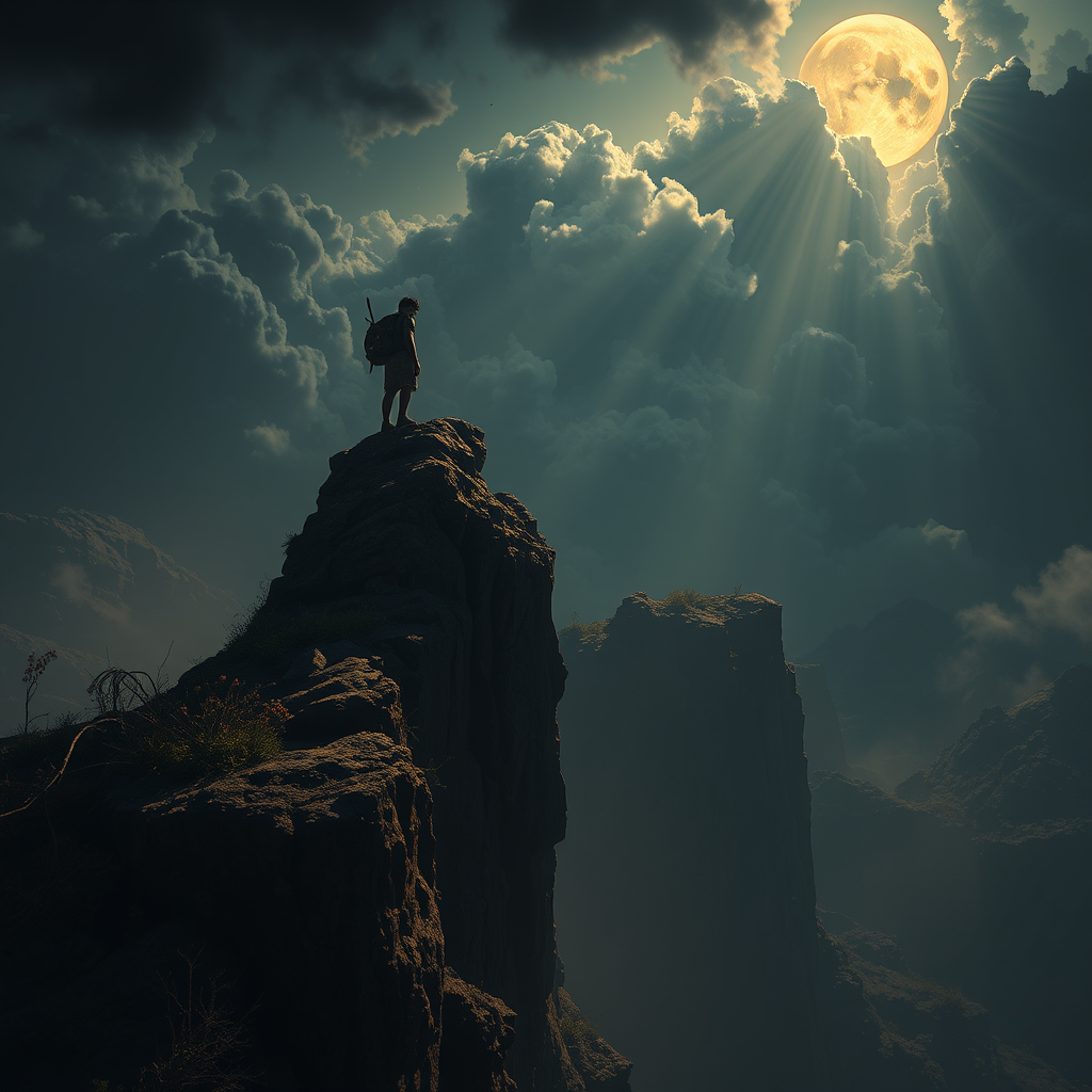 Standing at the precipice, teetering on the brink as the weight of destiny looms above, the echo of inevitable choice resonates like the devil's insistent knock. The scene is adorned with dramatic chiaroscuro, casting stark contrasts as if in a 5D realm, rendered with the meticulous detail of Unreal Engine. The environment is tinged with the whimsical yet eerie style reminiscent of "Don't Starve," with haunting landscapes and twisted flora. The concept art is breathtaking, inspired by the vivid imagination of Stanley Artgerm, blending surreal elements with striking depth and ethereal light, invoking a world where reality and fantasy converge in a tense, anticipatory moment.
