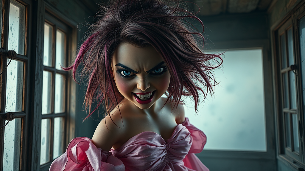 bjddoll, woman, moody atmosphere, intense, unkempt, furious, stunning, wild, silky, pink, spectrum of colors, surreal, silly, grinning, warrior, gown, messy, shocked, flustered, intricately detailed, hyper-realistic, observing through windows, exceptionally lifelike, photo-realistic, captivating setting, weathered paint, tempest, photograph.