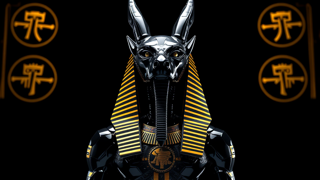 Masterpiece sculpture of Anubis "God of Death" in a futuristic reinterpretation, avant-Egyptian, The monumental god figure is intricately designed with an innovative touch. Sculpted in glossy black obsidian with shimmering gold accents, interlocking modular components, adorned with sacred hieroglyphs. Set against a dark backdrop, illuminated by softly projected Egyptian symbols in ethereal light. Majestic and austere. Centralized portrait shot, showcasing laser-cut precision and hyper-detail, Sci-fi, futuristic-forward Egyptian.