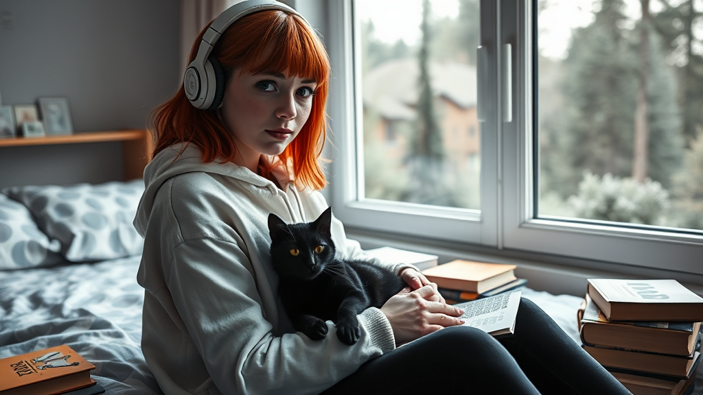 A captivating young Swiss girl sits by a window wearing headphones, surrounded by books. She is dressed in a cozy white hoodie and black jeans, her striking neon eyes and vibrant red hair complementing her smooth nose and thin lips. Her medium-length hair frames her beautiful face. As she gazes out the window and occasionally looks toward the camera, a black cat rests comfortably on her lap. The scene is set in a serene room with a bed behind her and a forest visible through the open window. The atmosphere is one of muted tones captured in professional photography, emphasizing soft natural lighting and an intimate, realistic portrait style reminiscent of an 85 mm lens. This creates a magical, dramatic effect with photorealistic, intricate details. The setting exudes a mysterious and mystical vibe, adding depth to the portrait's intimate composition.