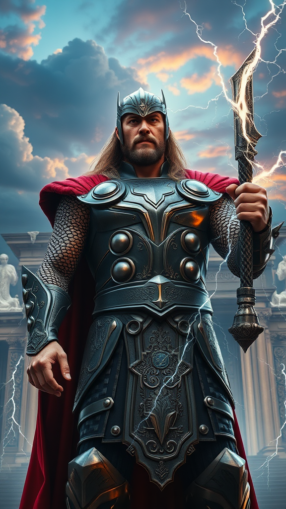 A hyper-realistic depiction of Thor, the God of Thunder, showcasing awe-inspiring armor adorned with intricate and symbolic engravings that tell ancient tales. In his right hand, he wields Mjölnir, crackling with vibrant energy as lightning bolts dance around him. His presence is commanding as he stands at the majestic entrance of Valhalla, the grand hall shimmering against a backdrop of celestial clouds. The atmosphere is charged with electricity, highlighting the immense power emanating from the Norse god, under a sky painted with hues of twilight.