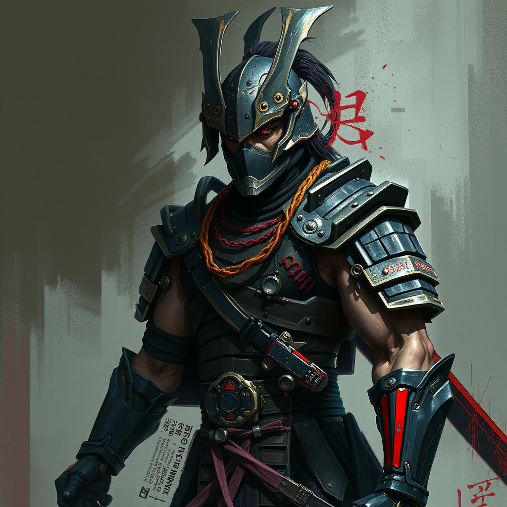 A digital painting of a cyberpunk samurai in a bold, Marvel-inspired anime style. The composition is epic and dramatic, utilizing dark, muted colors. The samurai is depicted with intricate armor, embodying a blend of brutality and sophistication. The image is intentionally distorted, featuring jpeg artifacts and a low-quality aesthetic. The figure displays exaggerated and grotesque anatomy, with poorly drawn hands and a deformed face. There are elements of mutation and disfigurement, including extra limbs and malformed features. The proportions are intentionally incorrect, with missing or duplicated limbs, contributing to a surreal and unsettling appearance. The piece includes random elements like text, cut-off or censored parts, and hints of watermarks, all adding to the chaotic visual narrative.