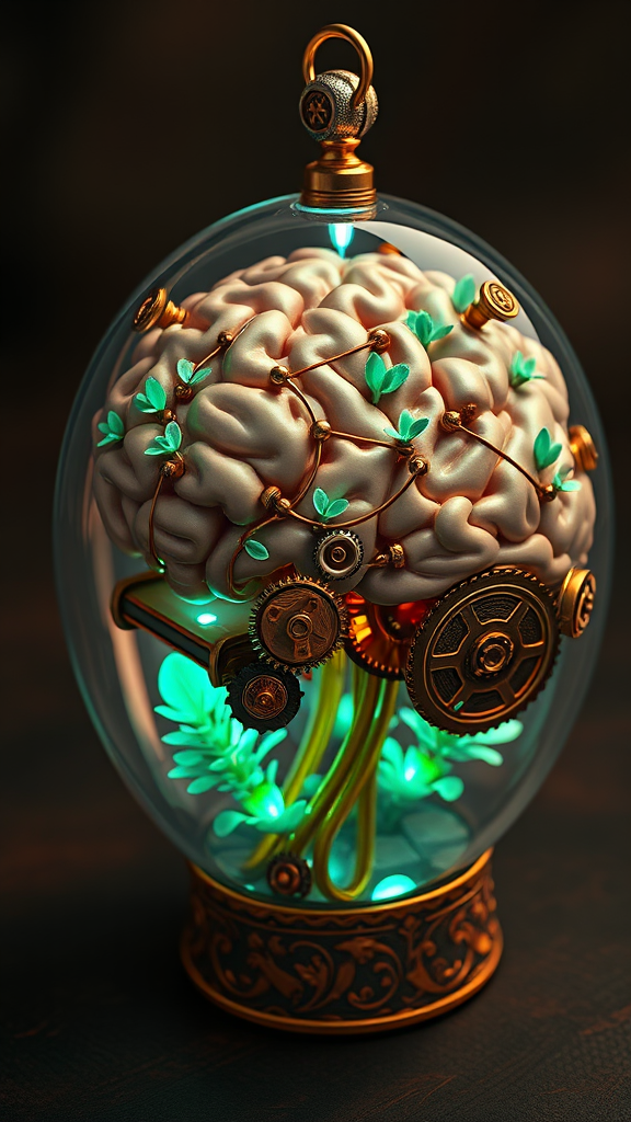 A hyper-realistic 3D render of a sci-fi baroque brain device blending steampunk aesthetics with scientific precision; the anatomically correct brain structure is encased in a transparent terrarium filled with bioluminescent plants. Intricate copper and brass details interlace the surface, with gears and cogs subtly ticking within the design, casting dynamic shadows. Fine tubing feeds into the device's organic form, merging technology and biology. The exterior features ornately engraved patterns inspired by baroque art, with a delicate patina hinting at its timelessness. The overall composition captures the essence of futuristic elegance combined with a meticulous scientific approach.