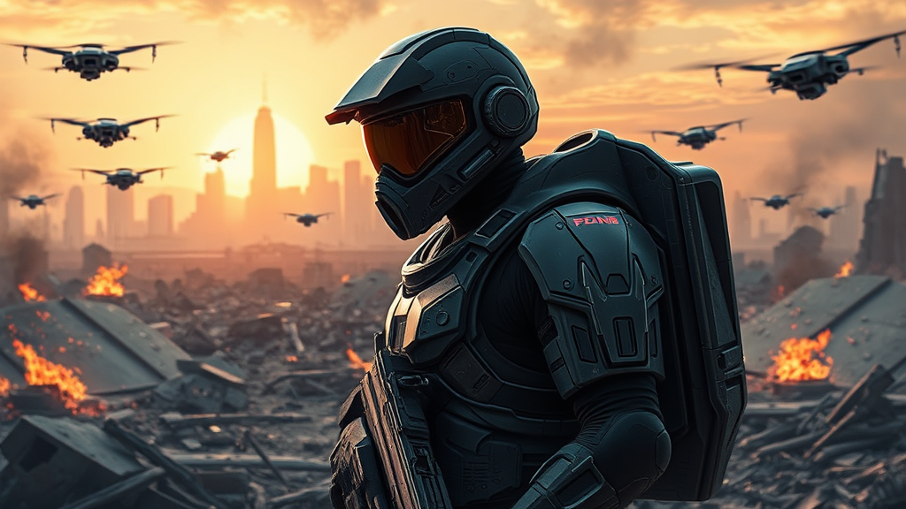 Ultra-high-definition dynamic lighting, intricate and detailed digital painting of a sci-fi futuristic soldier in advanced armor, equipped with cutting-edge weaponry and a sleek, tinted visor. The soldier stands poised against a devastated battlefield, surrounded by hovering surveillance drones, smoldering debris, and the remnants of battle. In the background, the distant skyline of a futuristic city rises above the chaos, illuminated by the soft glow of an otherworldly sunset. Whirring drones fill the air, adding to the tension of the scene.