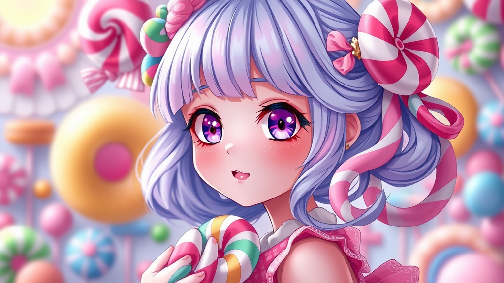 Candy-themed anime girl, Single Girl, Super Adorable, Playful expression, Petite stature, infused with cotton candy, candy cane, Bubble gum elements, Vibrant Colors, 🪐🌈🧁🎀💎, Fantasy setting, extremely detailed, Ornate patterns, 8k resolution, UHD, HDR, colorful and imaginative, unique character design, charmingly exaggerated features, dreamy atmosphere, blend of whimsy and fantasy, vivid palette, enchanted environment, joyful and cheerful vibe, artistic and whimsical elements infused.