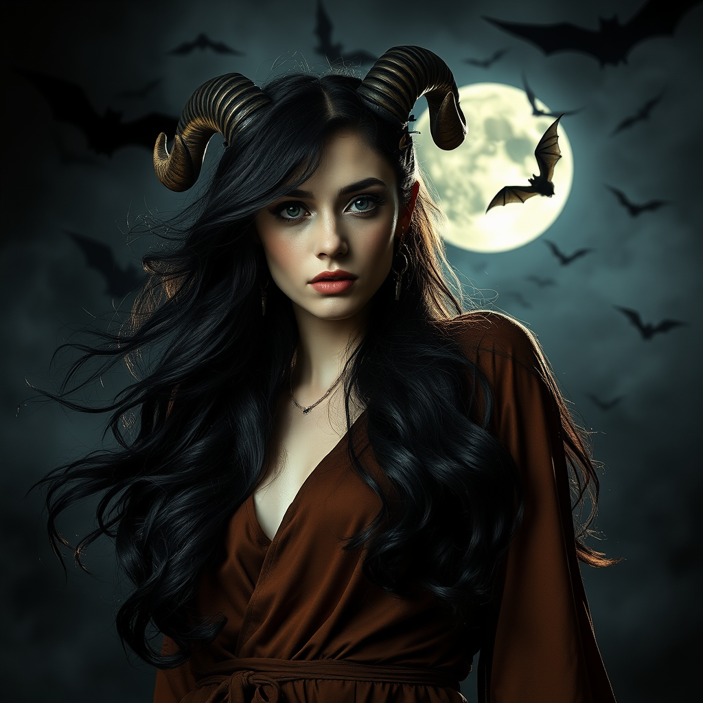 A mysterious woman with flowing, raven hair and elegantly curved horns stands in a shadowy, smoky setting, surrounded by fluttering bats. Her cascading hair, with gentle, undulating waves, frames her face with an enigmatic allure. She is clad in a rich, earthy brown dress that accentuates both her dark mane and the delicate horns crown her head. The backdrop is enveloped in shadows and swirling mist, while bats swoop through the air, enhancing the haunting ambiance. A dim, ethereal glow emanates from a luminous full moon perched behind her, casting a mystical light over the scene. Shot from a low angle, the perspective amplifies her commanding and enigmatic presence. This scene is captured in a fantasy art style, embracing dramatic lighting and vibrant colors, using a digital SLR or mirrorless camera with a wide-angle lens to encompass the vast, atmospheric backdrop.