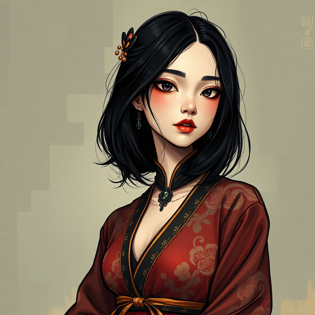 A dark-haired girl wearing an elegant Asian-inspired outfit, rendered in a subtle ink application style, blending elements of appropriation art with gothcore aesthetics. Her presence is captured through a ZBrush-inspired character caricature, with nuances of portraiture that hold hidden meanings. The painted illustration, rich in detail and allure, explores themes of identity and cultural fusion. The atmosphere is both mysterious and vibrant, drawing the viewer into a world of intricate contrasts and untold stories.