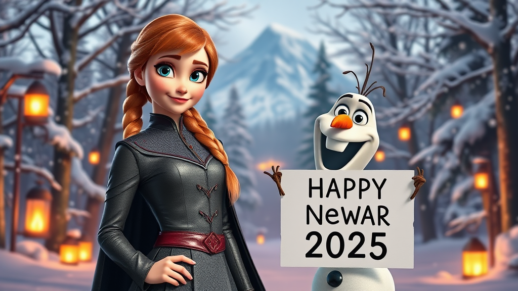 In an enchanting snowy landscape of Arendelle, Princess Anna stands confidently beside Olaf, who is holding a sign that reads "Happy New Year 2025". The scene is set against a softly lit winter forest with shimmering snowflakes gently falling and the warm glow of lanterns casting a magical light. Anna is depicted in a bold and daring light, embodying her spirited and adventurous personality. She wears a sophisticated and slightly daring version of her iconic outfit, crafted with high shine materials and featuring modern accents that highlight her confidence and charm. Her signature pigtails frame her face, adding a touch of familiarity. In the background, the majestic North Mountain can be seen peeking through the snow-clad trees, subtly nodding to the story's origins. Anna's vibrant and expressive personality is captured in her playful yet determined eyes, while Olaf's joyous presence adds a whimsical touch to the scene.