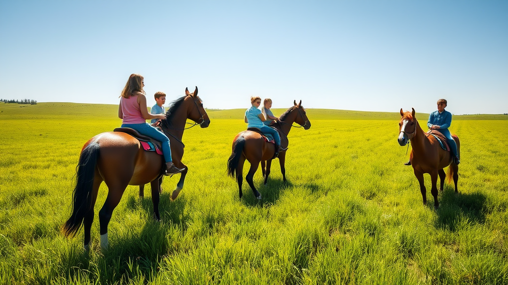 A lively group of students eagerly learns horseback riding in a sprawling green field under the clear midday sun. The bright sunlight casts gentle shadows on the vibrant grass, capturing a serene yet dynamic still moment. The scene is filled with the joyful energy of the students with their horses, as they navigate the basics of riding. The picturesque landscape and youthful enthusiasm create an inspiring, almost cinematic, outdoor learning experience.