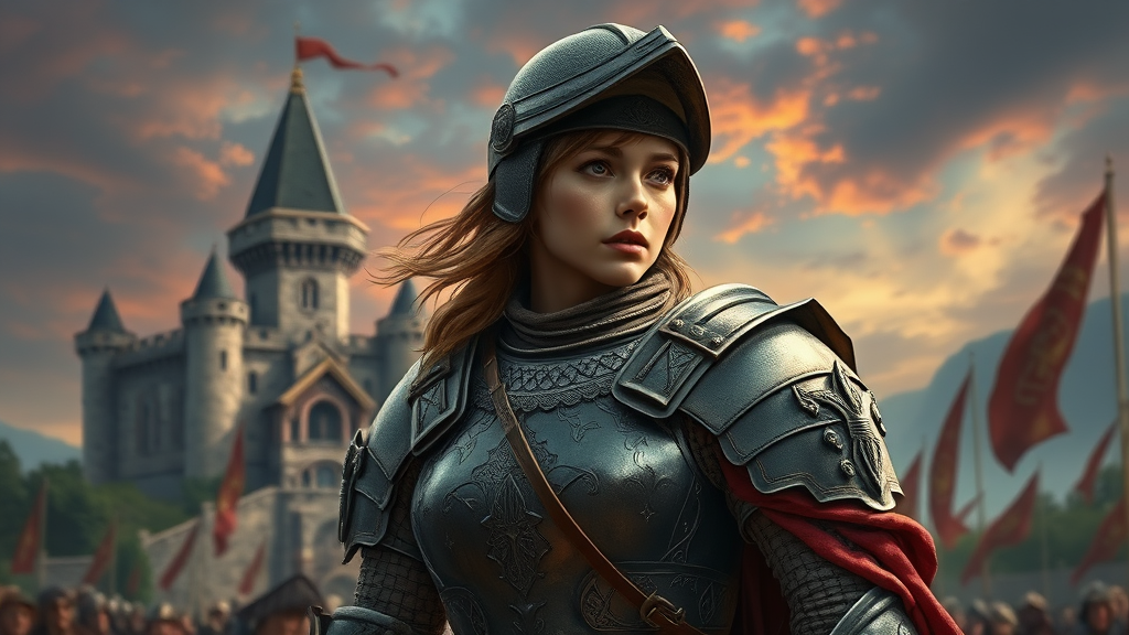 A valiant female warrior clad in intricately detailed armor, her visor lifted to reveal determined eyes, reminiscent of Joan of Arc, standing resolute amidst a medieval landscape where a castle looms in the background and banners flutter in the breeze, the sky painted in rich, dramatic hues.