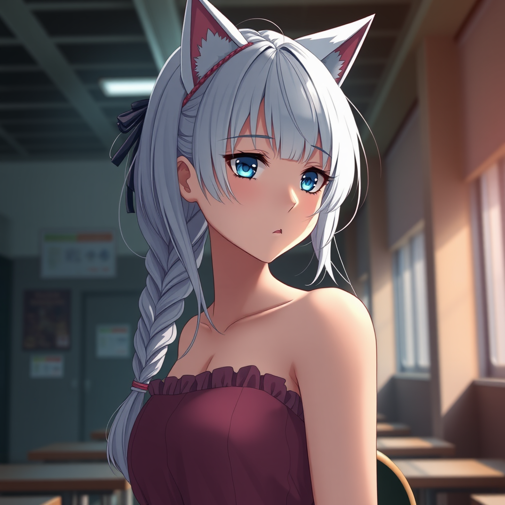 Solo anime girl full body young adult medium chest hyperdetailed school background medium white hair braid cat ears beautiful detailed blue eyes side view torso shot thick lineart anxious hyperdetailed natural light detailed reflection light volumetric lighting intricate vibrant panoramic cinematic masterfully crafted with rich deep color vintage show promotional poster glamour anime art fantasy art brush strokes UHD HDR Absurdres anime style photo manga style digital art glow effects hand drawn render dark atmospheric ultra detailed cinematic sharp focus hyperrealistic deep depth of field masterpiece vivid colors modelshoot style professional majestic painting intricate high detail drama photorealistic by midjourney and greg rutkowski no poor anatomy or rendering flaws no disfigurements no extra limbs no odd proportions maintained beautiful character design.