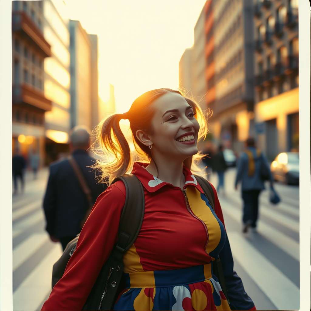 A happy woman with pigtails, resembling a joyful harlequin, strolls through the city at sunset, her smile radiant and eyes sparkling with delight. Her colorful outfit reminiscent of a playful clown, bounces with her every step. The scene is captured in a warm, dreamy Polaroid photo, with soft, volumetric lighting enhancing the atmosphere. The side view captures her carefree nature, making her a charming and cute figure against the urban backdrop.