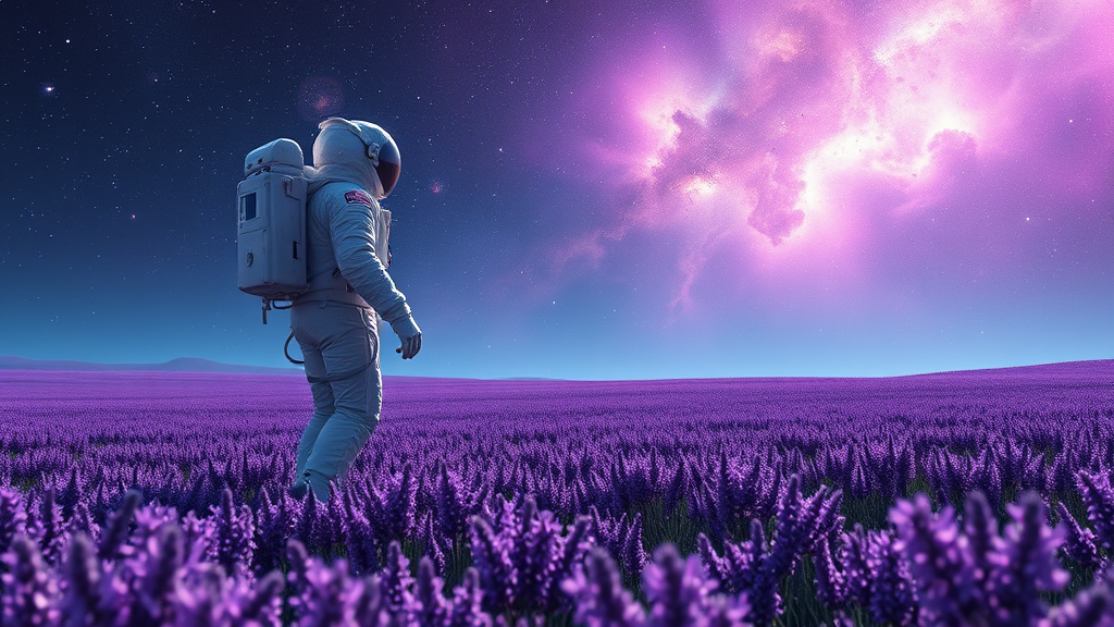 Astronaut exploring an expansive violet meadow under a vibrant, celestial sky, breathtaking sci-fi landscape, intricate details, 4k clarity, ultra-realistic visual storytelling, softly illuminated, nartfixer enhanced composition, subtly refined with nfixer, refined textures with nrealfixer touches.
