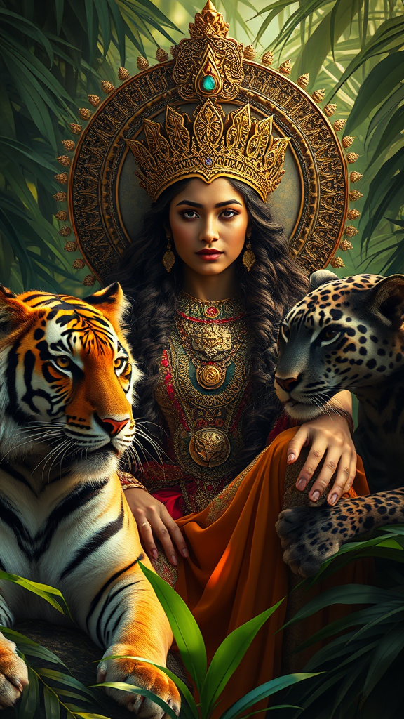 Breathtaking π goddess enthroned in the jungle, accompanied by a majestic tiger and a sleek panther, her intricately detailed face illuminated by cinematic light. Surrounded by a lush, vibrant environment, she exudes an aura of power and grace. Influenced by the artistic style of Annie Leibovitz, the scene captures a moment of serene authority, with subtle creative enhancements reminiscent of Pratik Naik's refined retouching.