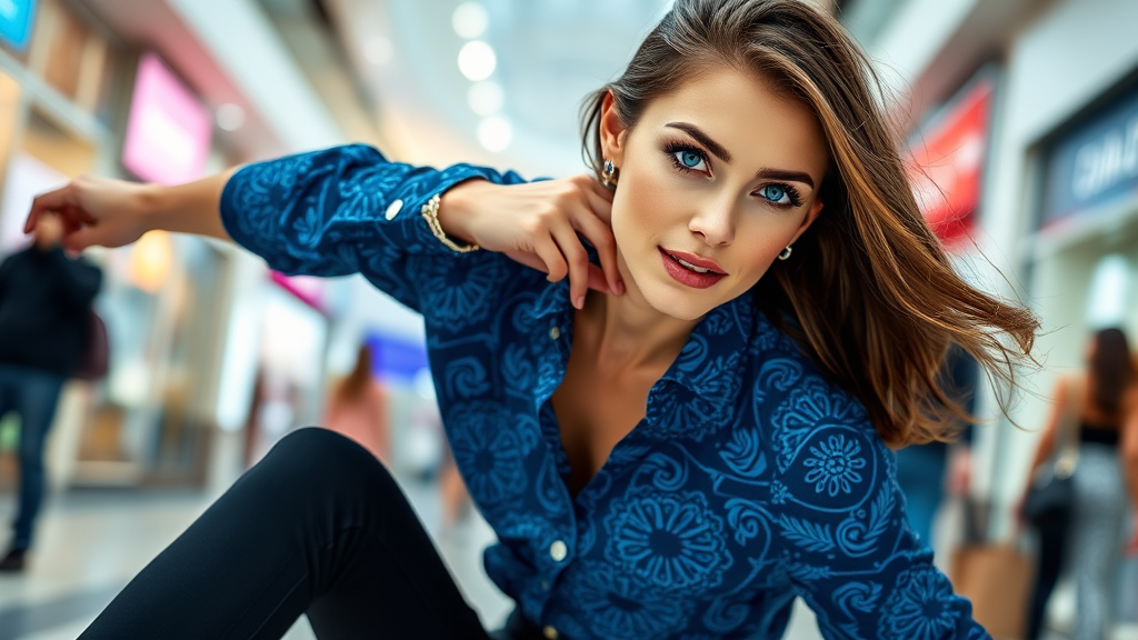 Full body shot portrait of a stunning model with striking blue eyes gracefully moving, wearing a vibrant blue batik casual shirt paired with sleek black jeans, styled as an elegant fashion shot, editorial quality, intricate detailing, high contrast, set against the lively backdrop of an indoor shopping mall.