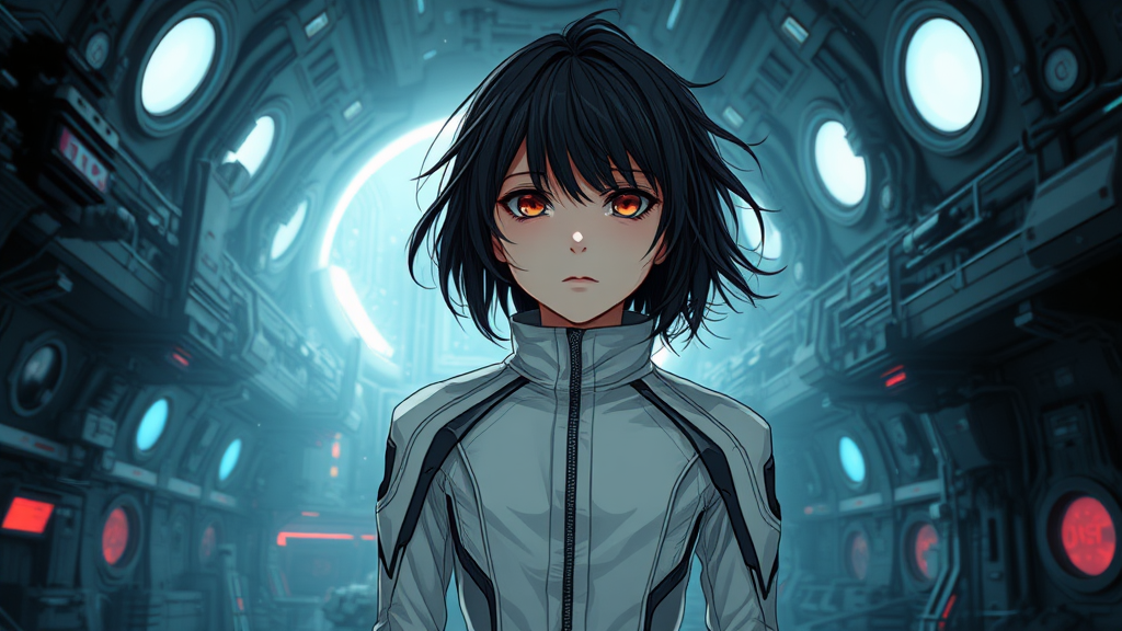 Tsutomu Nihei-inspired scene featuring a young girl in a sleek white sci-fi jumpsuit, set in a cyberpunk-themed spaceship interior. Her hair is intricate and dynamic, giving a sense of movement in the cold, gloomy room. The room is detailed with sharp angles and multi-storey structures, blending anime aesthetics and gigantism in muted colors. A singular bright lumen accentuates the scene with many small intricate details casting sharp shadows. The futuristic environment is enhanced by fluttering clumps of energy and sporadic flashes of light, delivering a hyper-detailed third-person perspective. The portrait captures her cold, lifeless expression, with unique round elements and vibrant red accents mingling with blue lumens. The composition plays with deformed elements, creating a surreal atmosphere, featuring distorted anatomy and unsettling mutations like duplicated facial features and limbs, folded torsos, and abstract torsos. Blurred backgrounds and overlapping forms convey a sense of disorientation, while round windows and circle motifs emphasize the sci-fi style. The overall image exudes a blend of futuristic dissonance and artistic uniqueness, capturing the essence of a space where natural and unnatural meet.