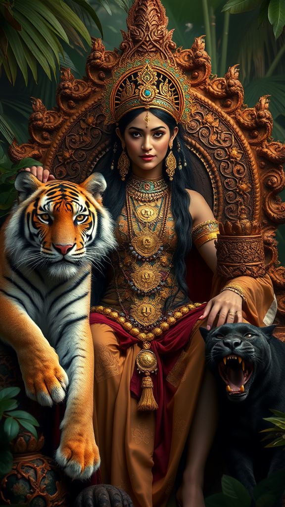 Gorgeous goddess with symbols of π intricately woven into her attire, accompanied by a regal tiger and a stealthy panther, seated majestically on a nature-crafted throne amidst an opulent jungle setting, enveloped in cinematic lighting that highlights the richness of the junglecore aesthetic; her face is rendered with exquisite detail, reminiscent of a character portrait by Annie Leibovitz, with artistic refinement added by Pratik Naik, enhancing the vibrancy and allure of this mystical and captivating scene.
