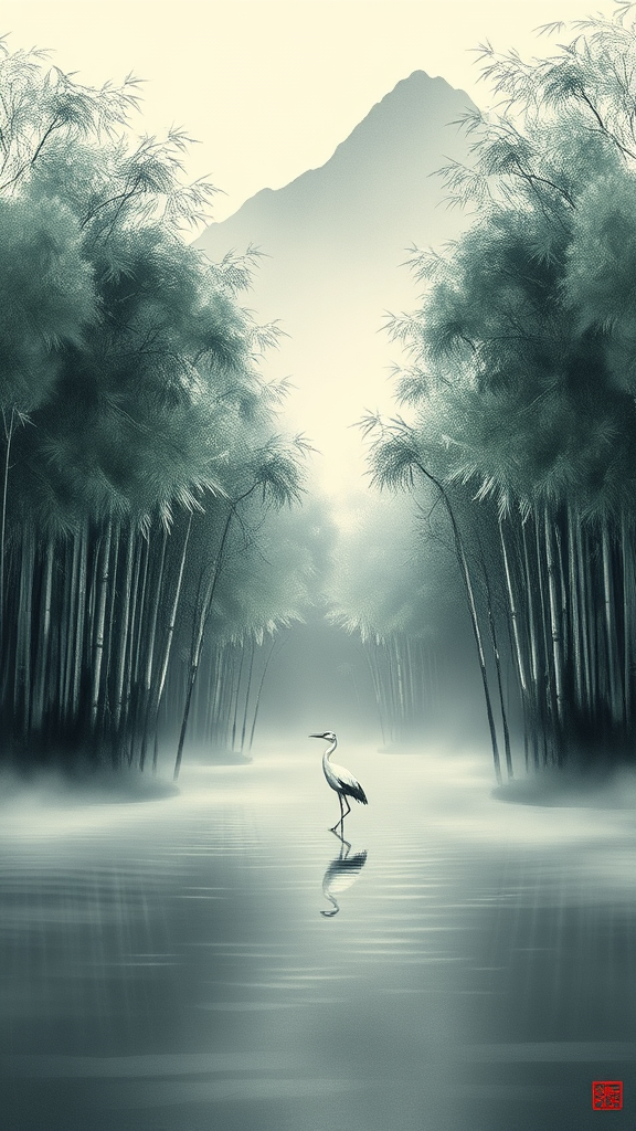 Envision a serene landscape captured in the style of suibokuga, where delicate ink brush strokes compose a towering bamboo grove gently swaying in a soft breeze, framed by mist-shrouded mountains in the distance. The vertical expanse of the scene reveals intricate details of each leaf and stalk, juxtaposed against a sea of tranquil, flowing water underneath. Amidst this breathtaking panorama, a solitary crane stands gracefully on one leg, its reflection rippling subtly across the water's surface. The harmonious balance of nature and minimalist beauty is stylized with an ethereal touch, evoking a sense of calm and timeless elegance.