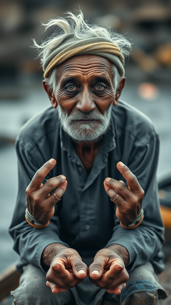 A professional medium-shot portrait of an elderly fisherman, approximately 50 years old, featuring a unique twist with robot eyes. Captured using a Nikon Z9, f/1.8, 100mm lens, the image presents intentional elements of artistic distortion, with exaggerated anatomy including extra limbs and fingers. The hands and feet are drawn with a purposefully abstract and surreal style. The composition includes intentionally blurred and fuzzy areas, emphasizing a dream-like state. The color palette is slightly desaturated, adding to the otherworldly ambiance. The fisherman appears slightly mutated and disfigured, with a focus on creative expression rather than realism, giving the portrait a unique, experimental feel.