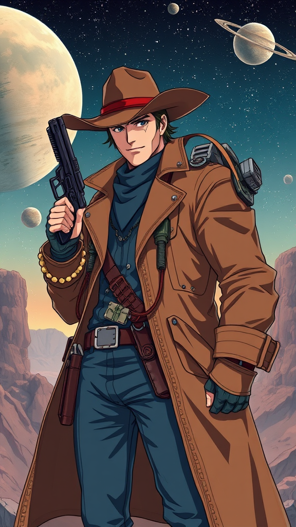 Legendary anime space cowboy inspired by John Wayne, blending the rugged charm of the Old West with a futuristic sci-fi flair. He roams the galaxy, much like the heroes from Cowboy Bebop and Trigun, wearing a classic wide-brimmed hat and a high-tech duster coat outfitted with cosmic gadgets. His laser blaster rests confidently in a holster, and his trusty starship, resembling a futuristic horse, is always ready for the next adventure. Set against a backdrop of distant planets and starry skies, this space western hero embodies the grit and honor of a bygone era with a modern twist.