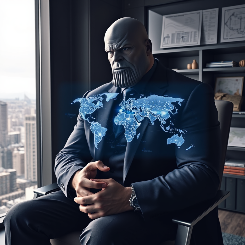 Thanos, a formidable businessman, sits in a sleek, modern office with floor-to-ceiling windows overlooking a bustling cityscape. His imposing figure is cast in dramatic light, highlighting his chiseled features and the intensity in his eyes. Clad in an impeccably tailored suit, he exudes power and authority, his fingers steepled thoughtfully as he contemplates a holographic projection of the universe, a cosmic blueprint for his corporate empire. The room is lined with shelves holding strategic blueprints and relics from his past successes, a testament to his calculated ambition.