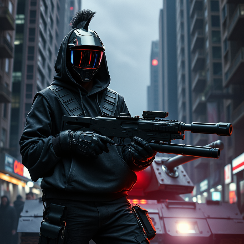 Masterpiece, full-body shot, intricate raw photography. Cyberpunk, realistic, highly detailed 3D rendering, top quality, masterpiece, ultra-high-resolution. Cowboy-themed image, photorealistic, raw portrayal, official art, dramatic angle, complex, surreal background, atmospheric and sinister, with a tank. Showcases dynamic angles, advanced cyber helmet, mecha elements, robotic armor, mechanical limbs, exo-suit, science fiction, devoid of humans, worn asymmetric attire. Tactical oversized black hoodie, cutting-edge black helmet with HUD, modern ultra-realistic design, Daft Punk-inspired cybernetic headgear, black tactical gloves, black techwear cargo pants, forward-thinking fashion, punk mohawk, rebellious punk-rock spirit, cinematic sci-fi ambiance, synthwave essence, night setting, dark and intricate details, futuristic and sharp, precise focus, aggressive stance, high-tech weaponry, vibrant hues, serious tone, cyberpunk cityscape, street neon glow, Insta-worthy frame, Photo of the Year contender, achieved with cinema4d, dramatic lighting and shadows, authentic visual effects, realistic Octane rendering, highest-quality photorealistic output, enhanced with minor creative adjustments maintaining the core concept.