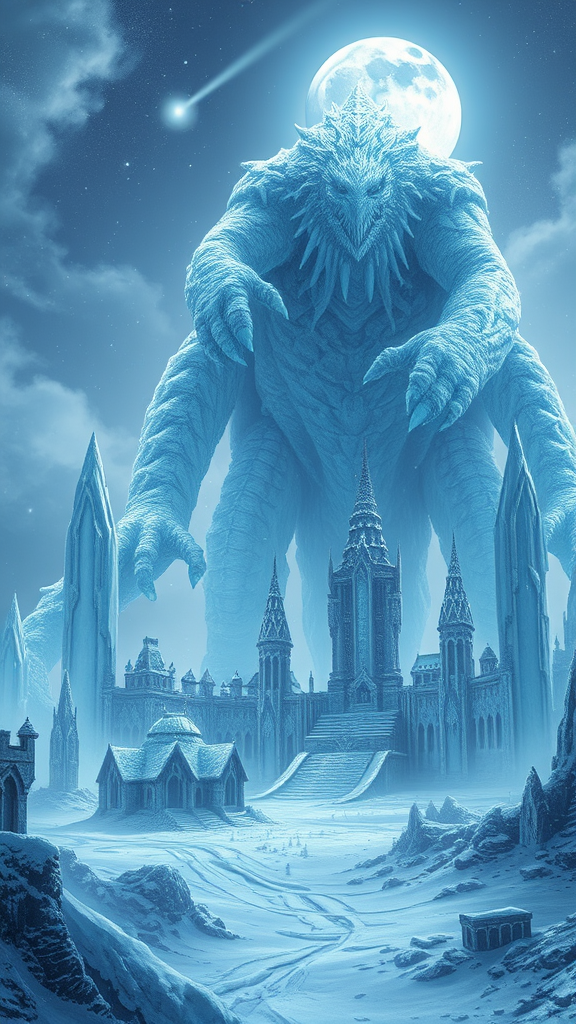 An immense ice creature looms over an ancient city, its frosty form blending seamlessly with the snow-covered ruins below. Towering spires and crumbling structures are encased in thick layers of glistening ice, reflecting the pale blue light of the moon. Cold winds swirl around, carrying the distant echoes of a once-vibrant civilization now frozen in time. The monster’s crystalline skin shimmers like a million tiny stars, its breath a chilling mist that blankets the landscape. In the silence of the frozen night, the creature stands as both guardian and specter of a forgotten era, preserving the secrets of the city beneath its icy embrace.