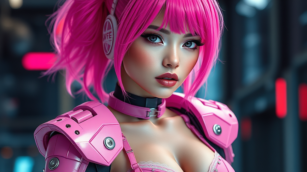 Gorgeous female cyborg with vibrant pink hair, adorned in sleek pink combat armor and intricate cyberpunk-inspired lingerie, exuding a futuristic high-tech allure. She stands confidently, her striking features flirtatious and alluring, captivating the viewer in a detailed and realistic portrait. Her skin is intricately textured, rendered in hyperrealistic, 8k photo-realism, capturing every nuance under diffused soft lighting. The photography boasts a shallow depth of field and sharp focus, enhancing her cinematic and sci-fi presence. Her posture is poised, emphasizing the exquisite detail of her combat armor against a dreamy, high-tech backdrop. The image is free of any technical imperfections, showing no errors or artifacts. Her form is proportionate and anatomically correct, with an impeccable, high-detail presentation, and a glamorous yet enigmatic aura.