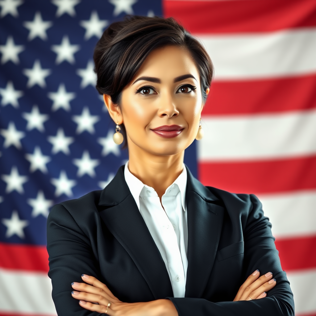 Confident businesswoman standing proudly in front of an American flag, professional attire, mature, poised, realistic style, assertive expression, focus on leadership and empowerment, American values represented, vibrant colors, dynamic composition.