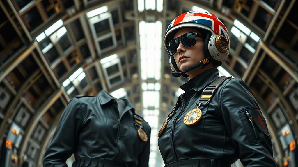 spacecraft hangar heroic female mechanic intricate detailed formal oak cool pewter leather uniform sci-fi futuristic cyberpunk medals utility belt cinematic lighting low angle dynamic posture to scale golden pilot sunglasses highest facial details masterpiece 8k dark tools realistic fabric folds vibrant creative background high contrast galaxy backdrop helmet hard surface flag stars union jack adventurous spirit dynamic energy subtle representation nuanced tasteful empowerment skilled craftswoman engineering prowess determined expression confident stance innovative technology sleek machinery cutting-edge design balanced proportions celebrated individuality