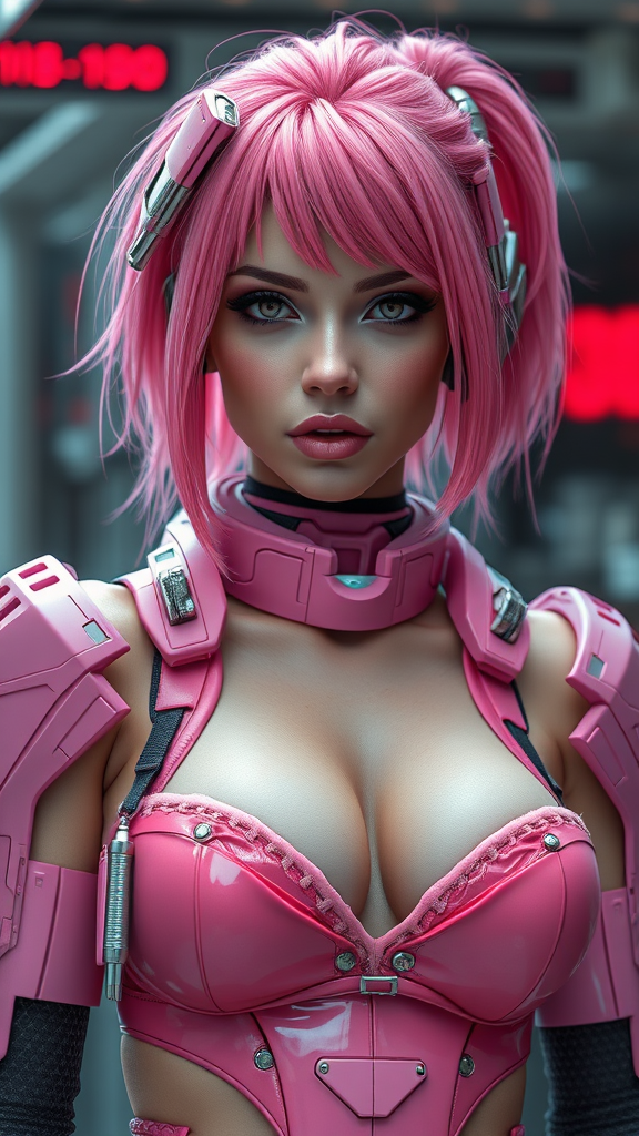 Gorgeous female cyborg with vibrant pink hair, clad in sleek pink combat armor, radiating a cyberpunk allure. Her ensemble is a perfect fusion of high-tech sci-fi elements and alluring lingerie accents. She exudes a flirtatious energy, posing confidently as she gazes directly at the viewer. This stunning portrait captures her in a realistic, photo-realistic style with exquisite detail. The image showcases intricate skin textures and is shot with diffused soft lighting, creating a cinematic atmosphere. It employs a shallow depth of field and sharp focus, emphasizing hyperrealism. The portrayal is highly detailed, resembling high-resolution CGI, and is set against a futuristic backdrop with a full-length, comprehensive frame. The composition maintains the essence of modern digital art, avoiding low-quality artifacts and visual errors, while ensuring aesthetic proportions and flawless anatomy.