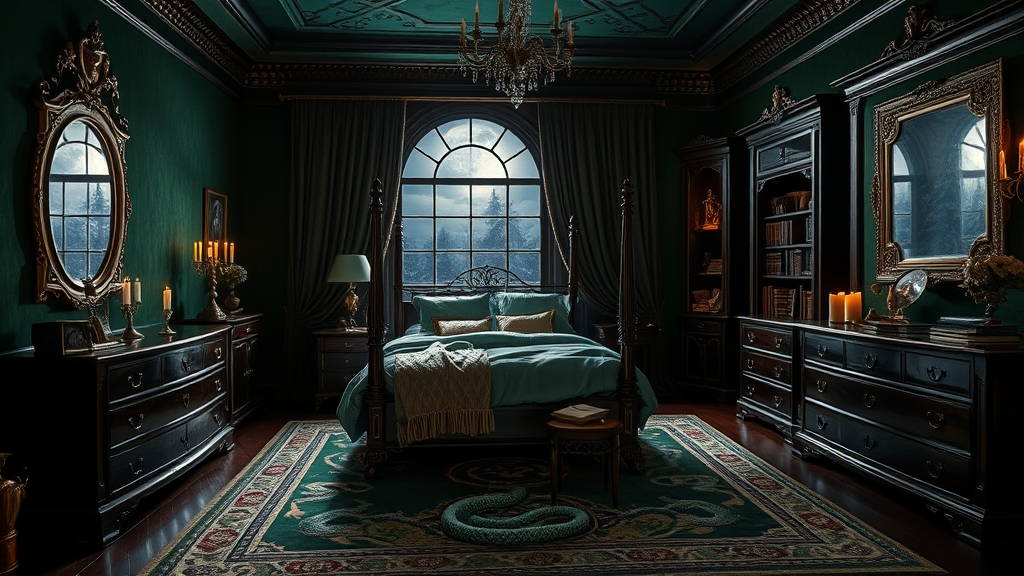 A dimly lit bedroom exudes an aura of elegance and mystery, its walls draped in deep emerald green velvet. Antique silver accents gleam subtly against the dark, polished wooden furniture. A four-poster bed, adorned with silky green and silver bedding, sits as the centerpiece, surrounded by shelves of leather-bound books and curious artifacts. The flicker of candlelight casts shadows on the snake motifs intricately woven into the plush area rug, and a large window frames a view of the moonlit night sky, with heavy, velvet curtains ready to draw and cocoon the room in quiet secrecy.