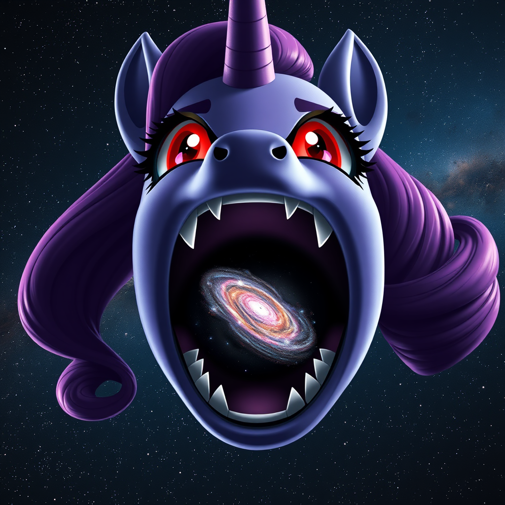 A colossal Twilight Sparkle from My Little Pony, her form spanning beyond comprehension, larger than a galaxy, suspended in the cosmic expanse. A tiny galaxy hovers delicately before her gaping maw, her eyes blazing an intense, otherworldly red. From an extreme close-up perspective, her open mouth dominates the scene as she prepares to engulf the galaxy, her features rendered in breathtaking photorealism, an awe-inspiring display of power and wonder amidst the star-studded abyss.