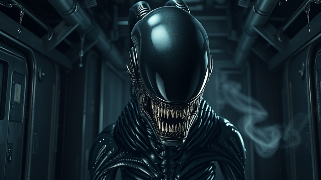 A RAW photo of a solo, intricately detailed portrait of an alien creature inspired by the Xenomorph from the Alien movies. The creature features a sleek, elongated head with a smooth, polished dome-like surface, creating an unsettlingly eyeless visage. Its mouth is adorned with short, razor-sharp metallic teeth, and an inner jaw resembling a small, formidable black box emerges from within, lined with additional sharp teeth. The skin is a glossy, obsidian exoskeleton that reflects light ominously, with intricate biomechanical ridges and tubes weaving across its head and neck. The background is a shadowy, industrial setting with metallic walls where water drips and steam wafts through the air, intensifying the creature's menacing aura. The lighting casts deep shadows that highlight the alien's terrifying and otherworldly nature, set within the confines of a dark spaceship filled with drifting steam and dripping water.