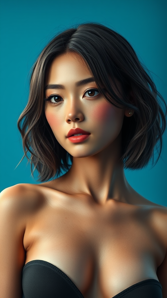 loose shoulder-length hair, blue background, ultra realistic, cinematic frame, cinematic, highest quality, subsurface dispersion, complex, shiny skin, photorealism, volume lighting, highly detailed, photorealistic, octane rendering, 8k, unreal engine, small breasts, ray tracing, bushy eyebrows, Steps: 66, Sampler: DDIM, CFG scale: 10, photorealistic appearance, vibrant colors, subtle expression, intricate textures, natural tones, radiant lighting, crisp details, dimensional depth, artistic composition