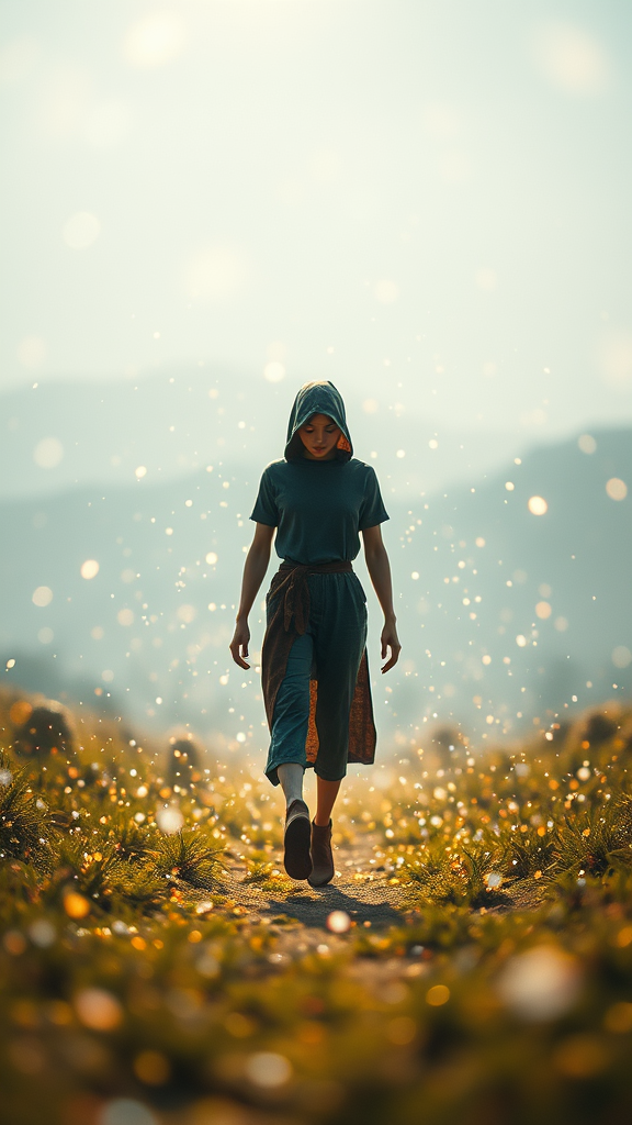 A lone figure walking through an ethereal landscape, particles of light dancing around them, creating a sense of motion blur; their eyes are incredibly detailed and hyperrealistic, captured in sharp focus and vivid 8k HDR. The scene is inspired by the artistry of Stanley Artgerm Lau, reminiscent of a masterpiece on ArtStation, with enchanting light particles and whimsical pixies in the background. The figure appears to float in a space where gravity seems optional, giving the impression of hovering. Despite the ethereal beauty, there is an element of surrealism, with elongated limbs and abstract proportions, adding to the fantasy-like quality of the scene. The composition remains cohesive, painting a picture of a dreamlike world that captivates the imagination.